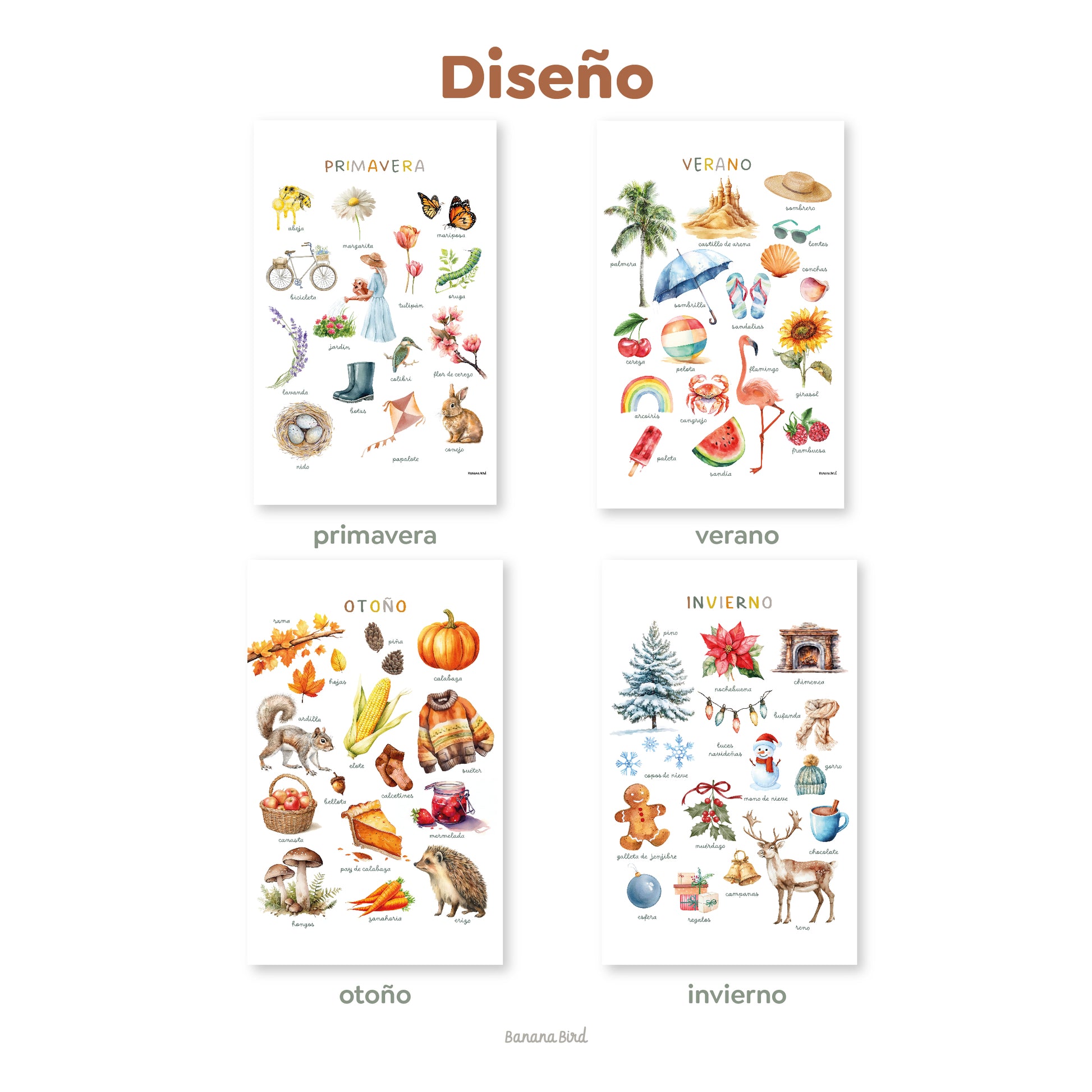 Cada ilustración —Primavera, Verano, Otoño e Invierno— incluye detalles realistas que despiertan la curiosidad y acompañan el aprendizaje de forma visual y significativa 🍃☀️🍂❄️